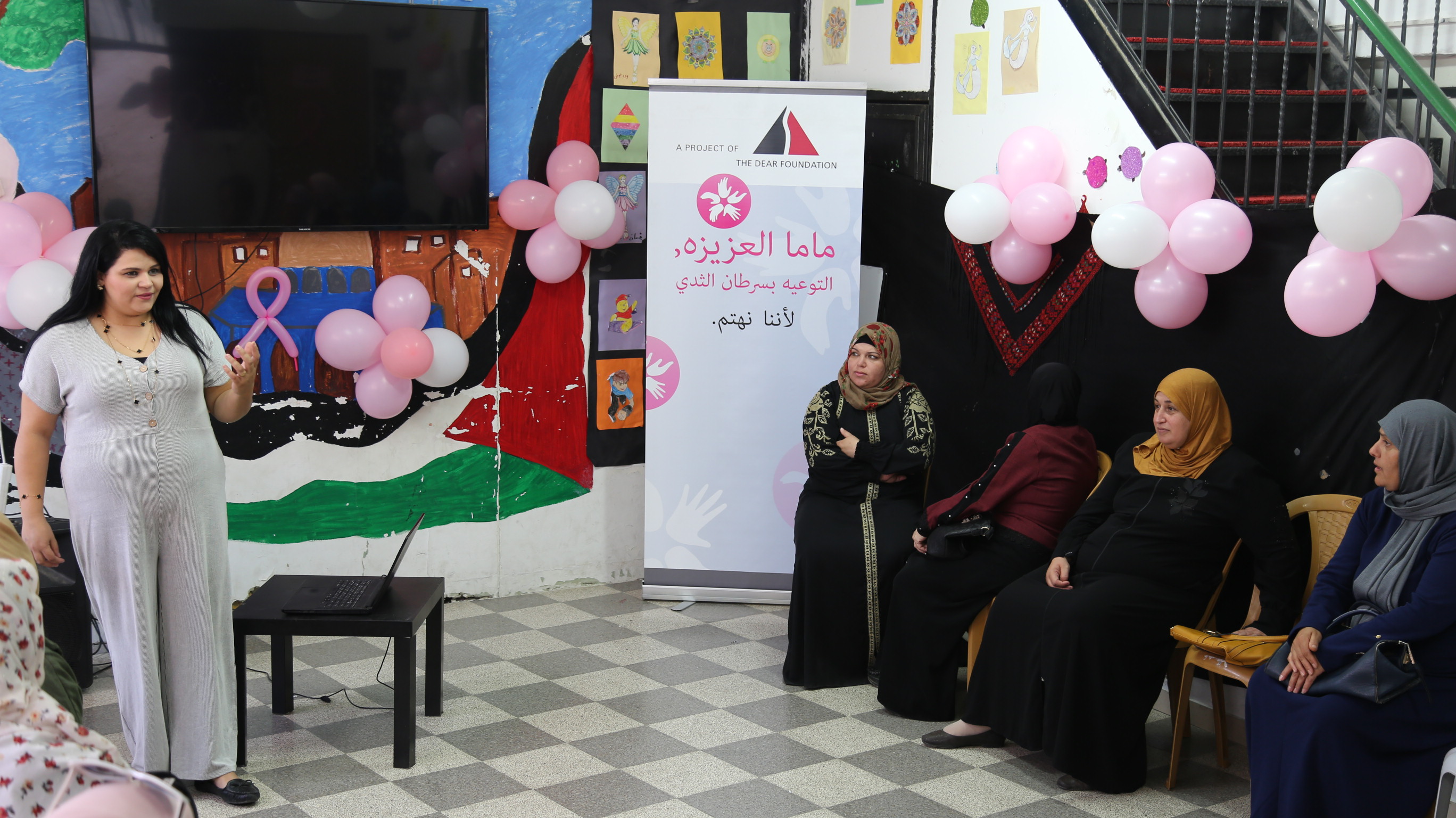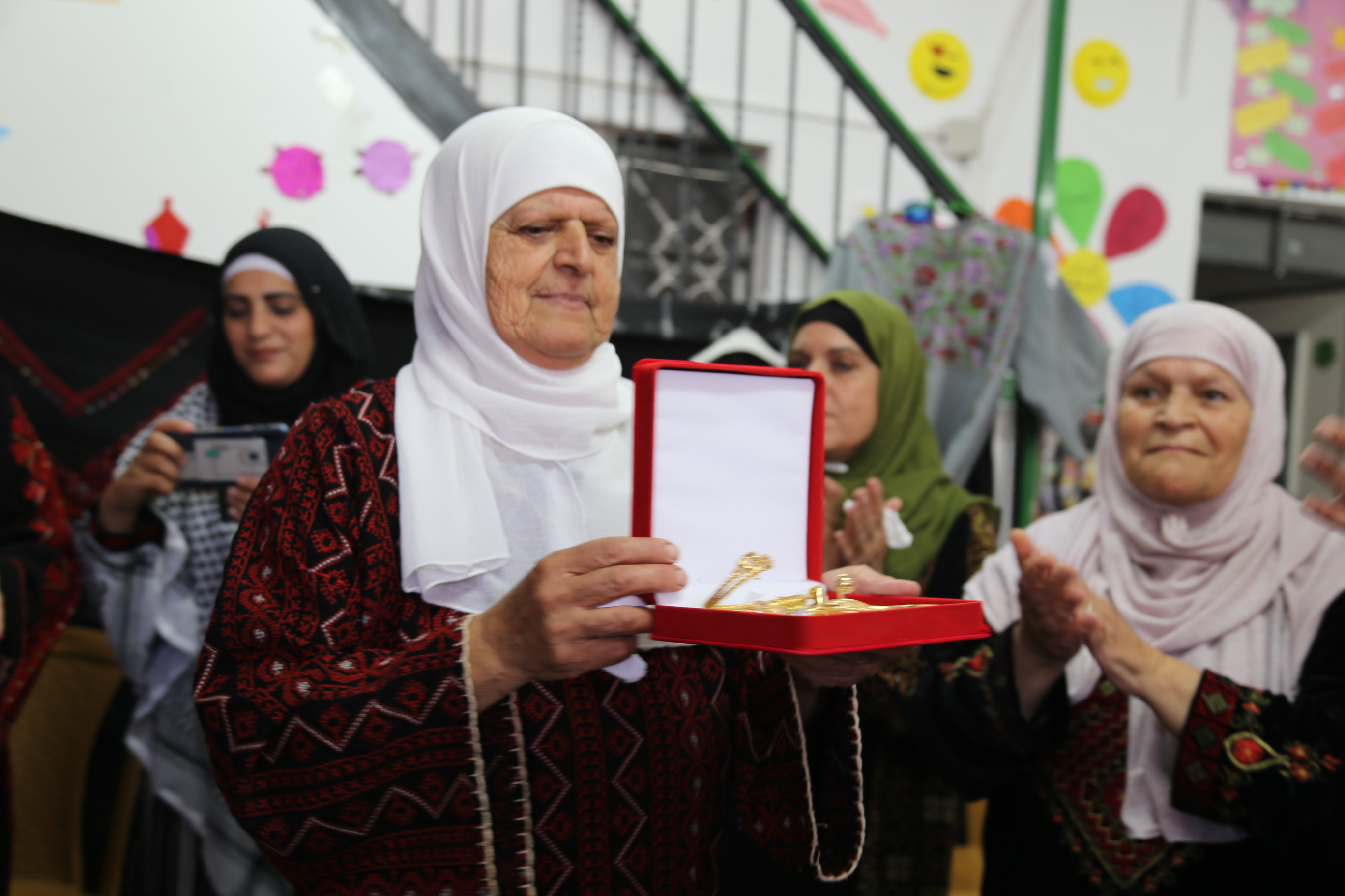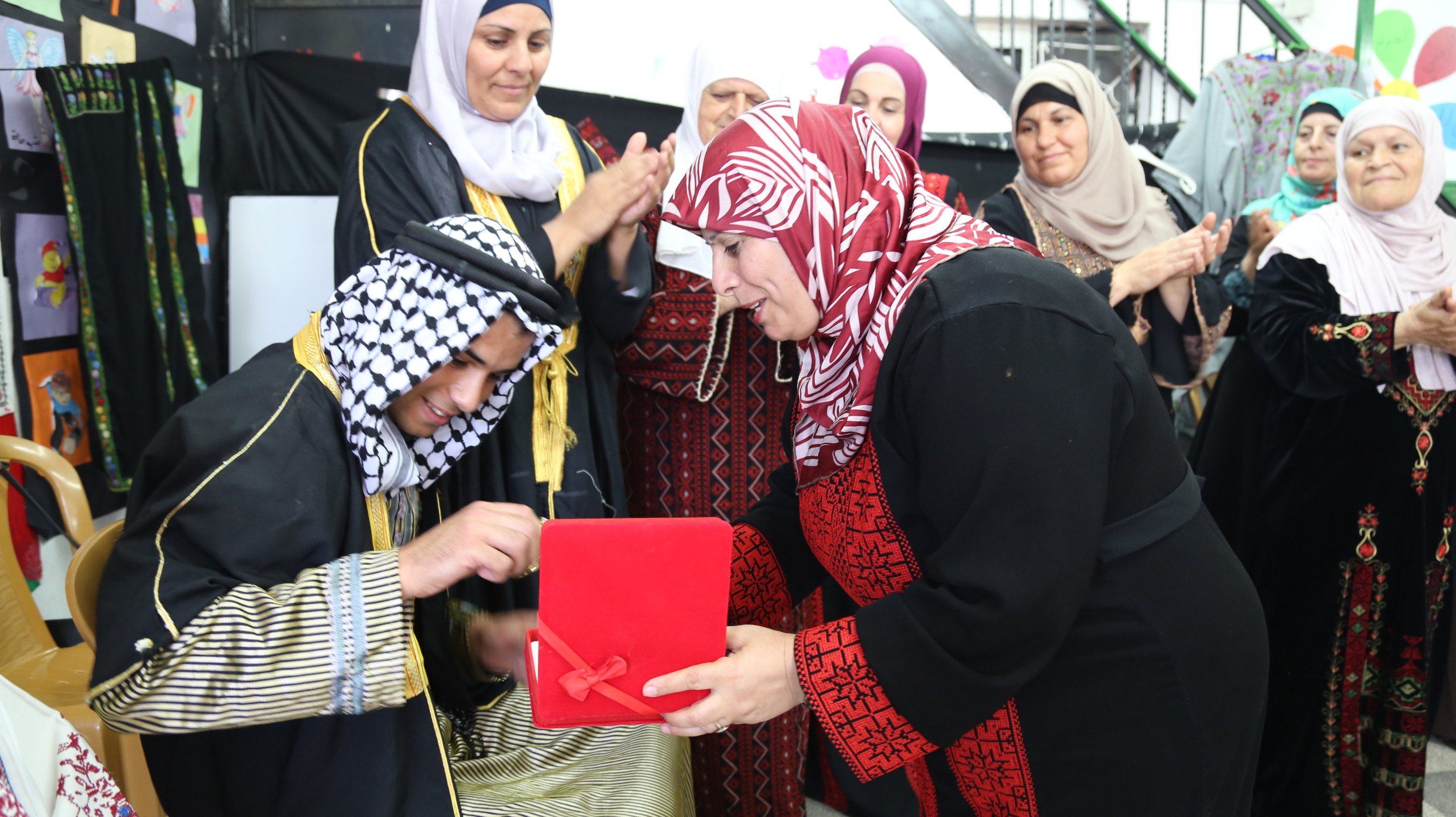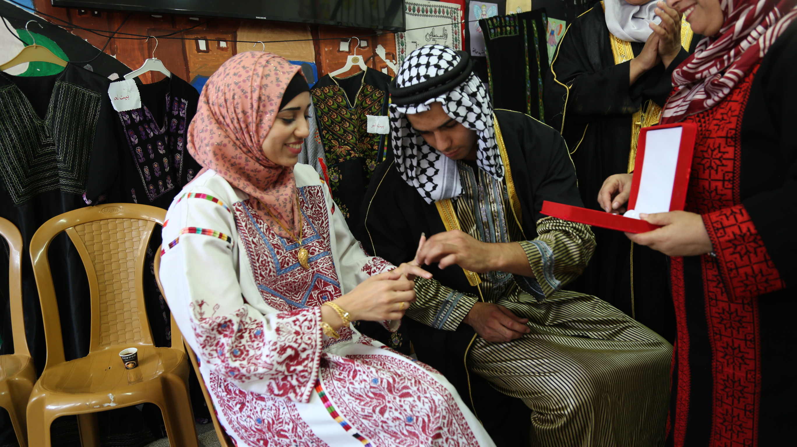 The atmosphere of the wedding in the center was similar to how it used to be in that period, where a group of women wore the Palestinian traditional dress embroidered in distinctive colors and surrounded the bride who adorned her dress and jewelry and the groom who wore the traditional hat (Tarboush) and golden embroidered robe. They sang songs and zagareed to celebrate them.