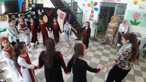 The activities varied between Palestinian folktale storytelling which was narrated by the coordinators of the center and the mothers of the children, the stories were about the lives of the Palestinians long time ago and about the tools they used to use. They also spoke about the customs and traditions and popular proverbs and about the olive tree, which symbolizes giving, persistence, its attachment to the ground and taking root in it.