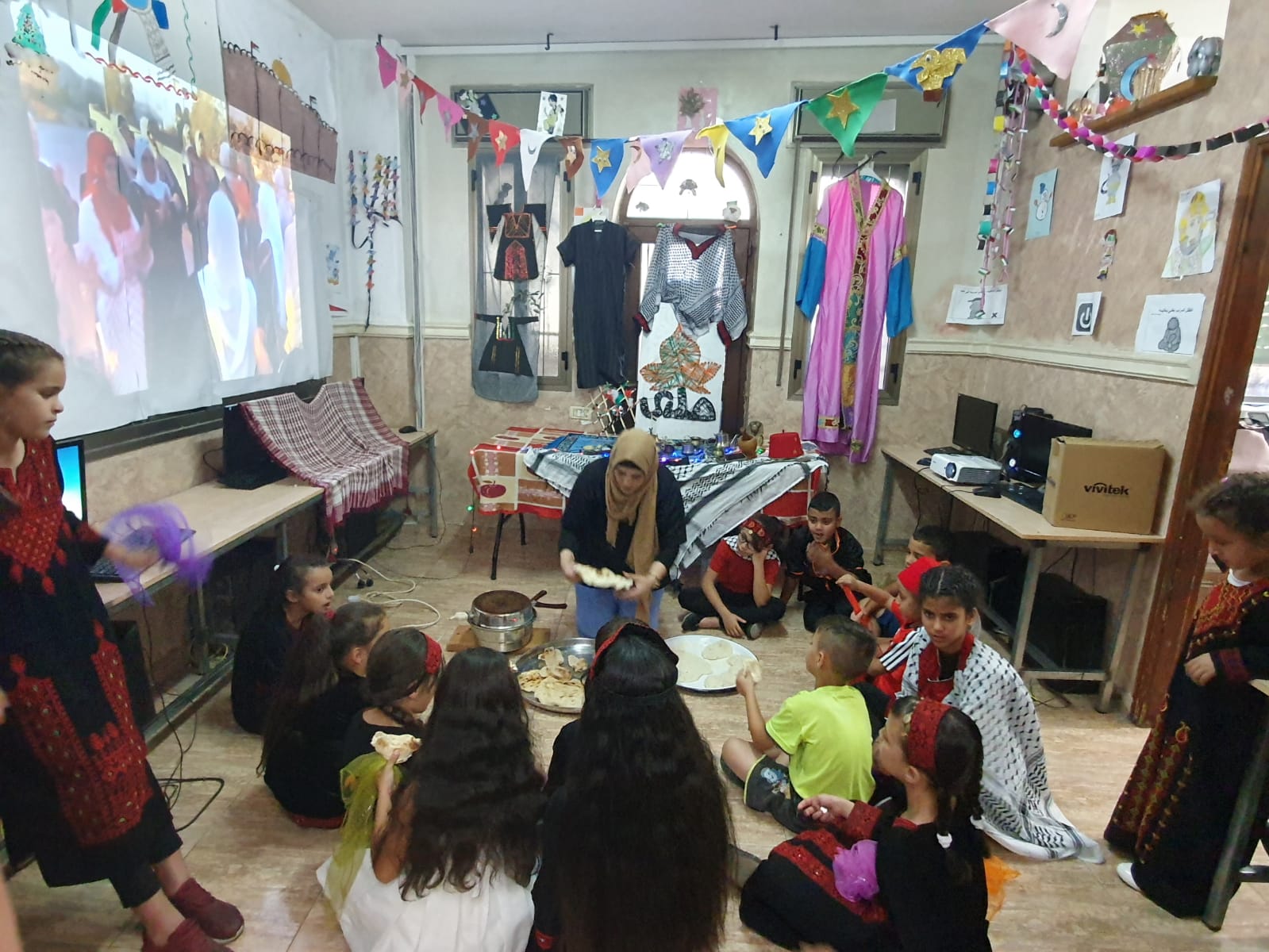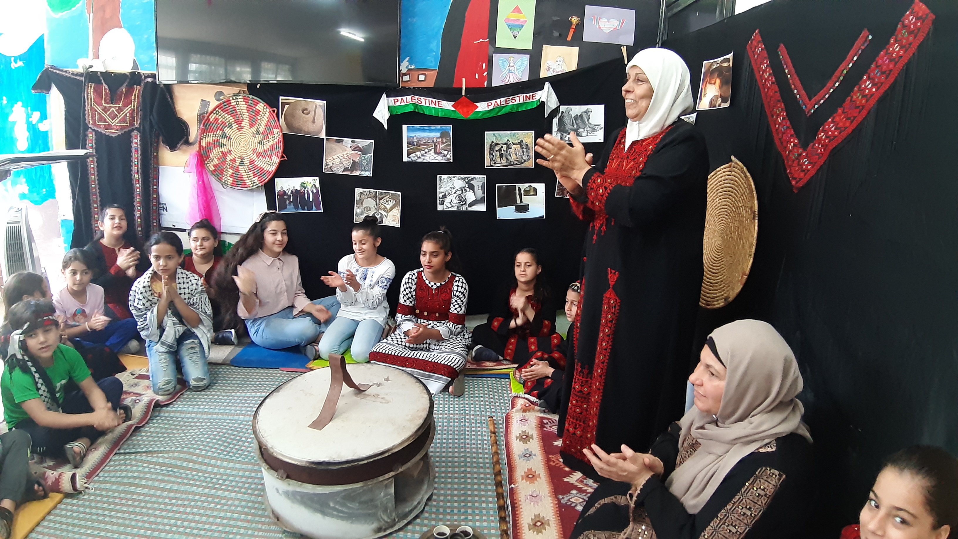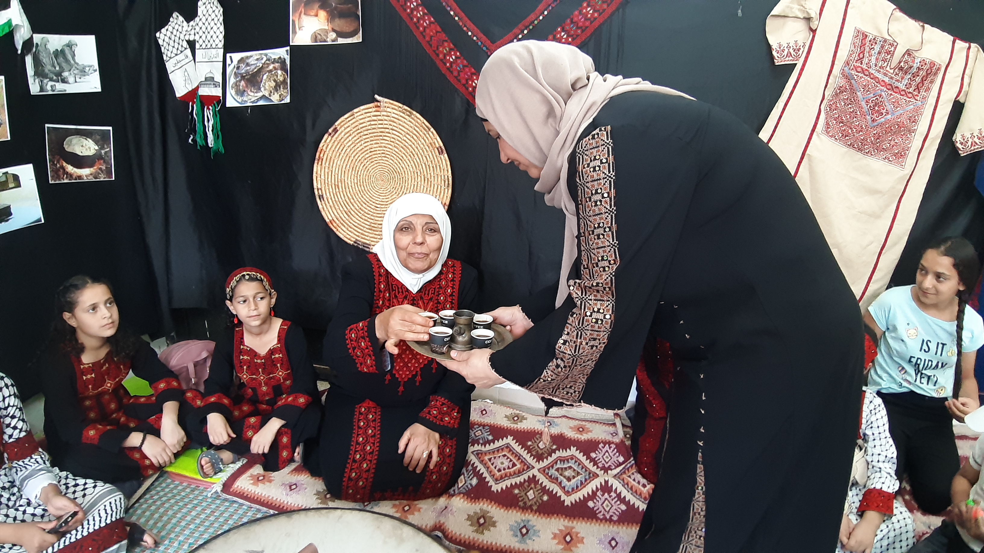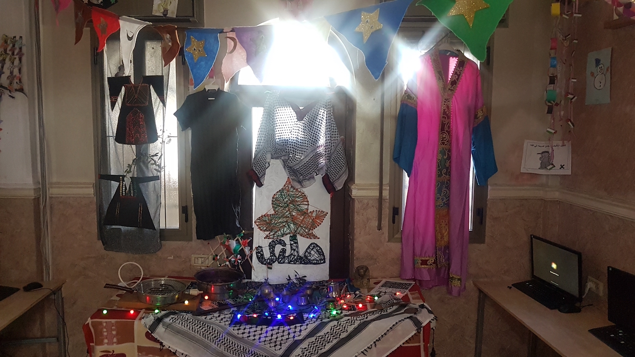 It is worth mentioning that the children had worn the Palestinian attire (the dress for females and the robe (qumbaz) for males) and participated in presenting traditional tools that they had brought from their homes.