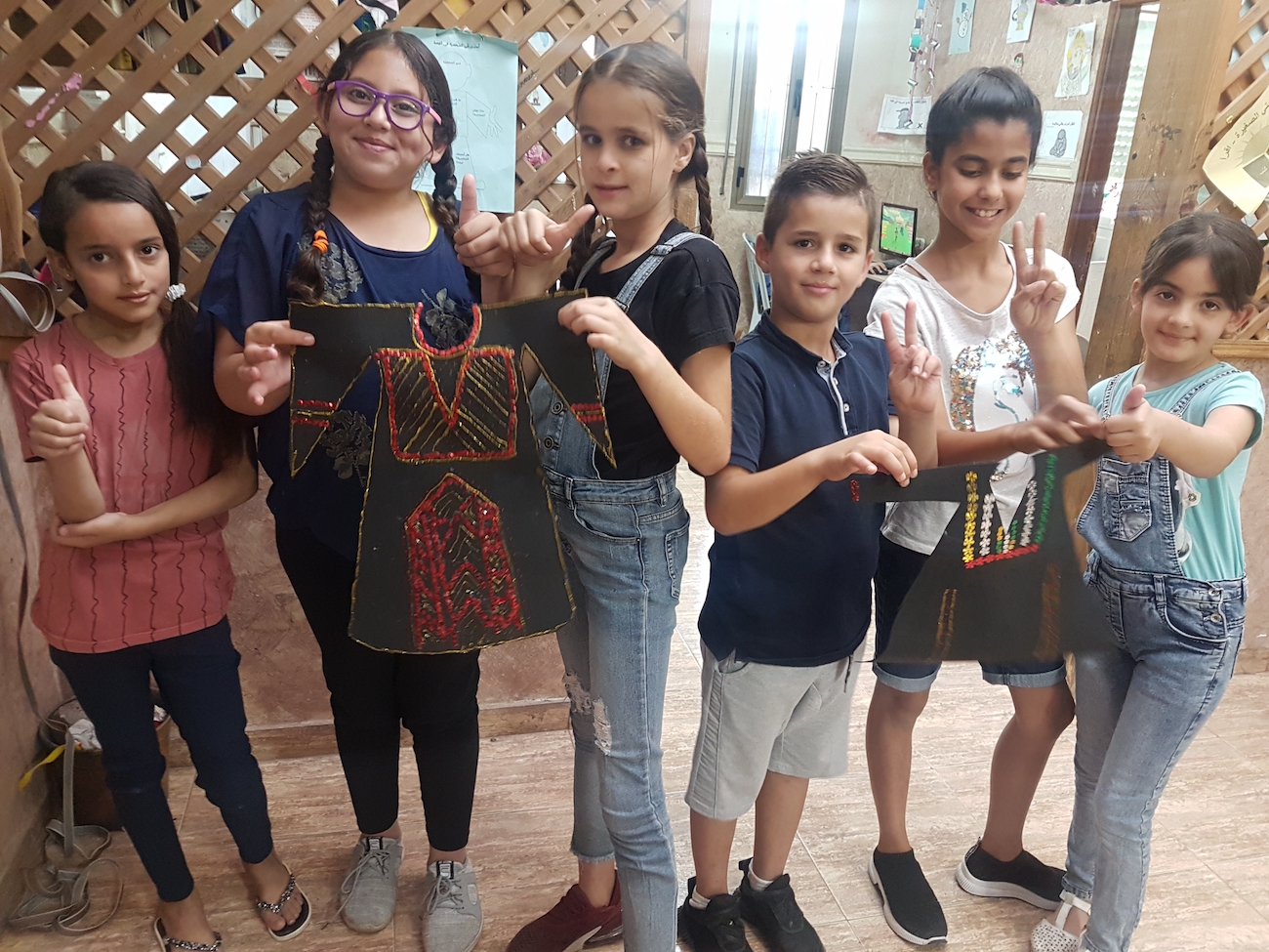 The children drew a Palestinian flag and old Palestinian houses; they painted a painting representing the dedication of Palestinian women wearing their Palestinian attire, and made embroidered pieces.